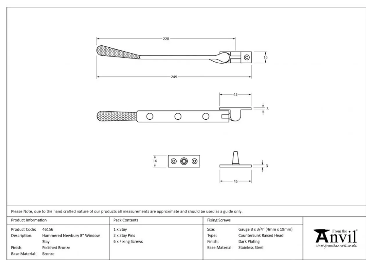 Anvil (8″”) Polished Bronze Hammered Newbury Casement Window Stay | 46156