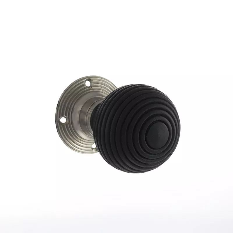 Set Old English Ebony Wood Whitby Round Reeded Mortice Knob on satin nickel rose